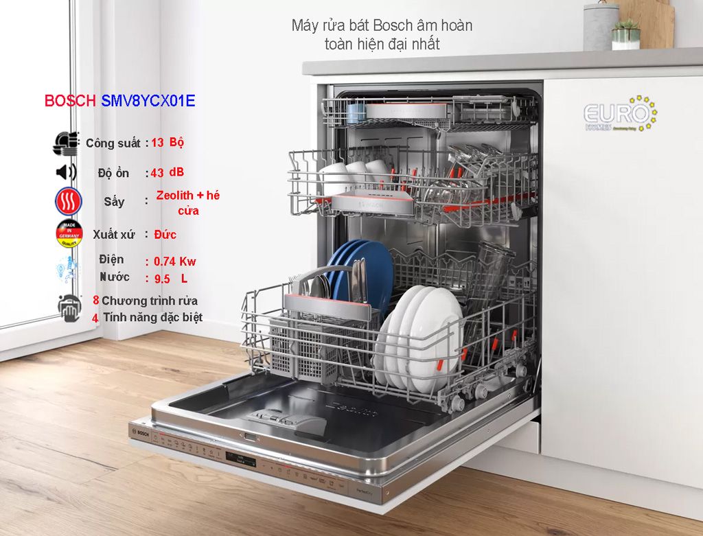Máy rửa bát Bosch SMV8YCX01E với tính năng rửa mạnh trong trường hợp đồ bát đĩa có độ bẩn nhiều. Cực kỳ thích hợp cho việc rửa nồi.