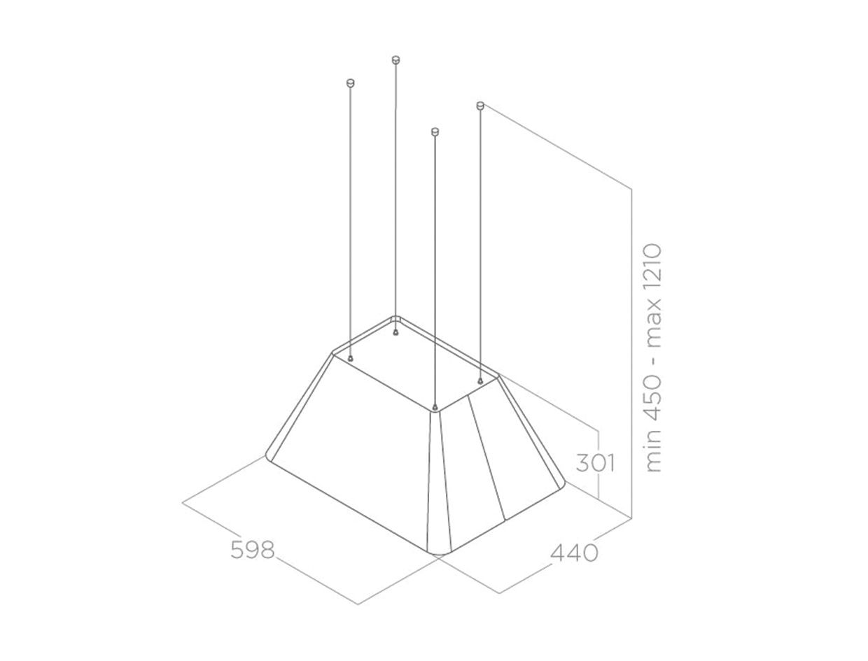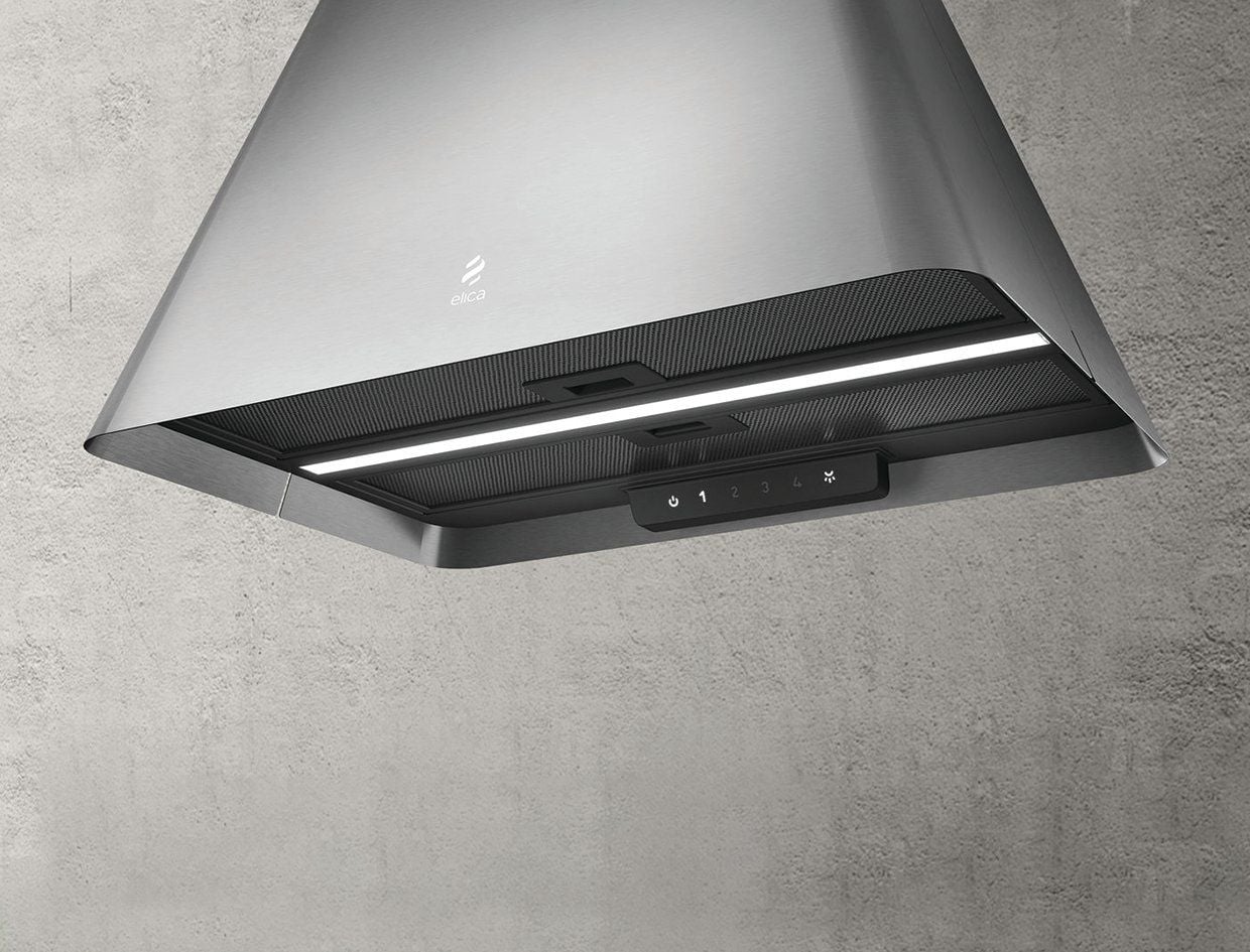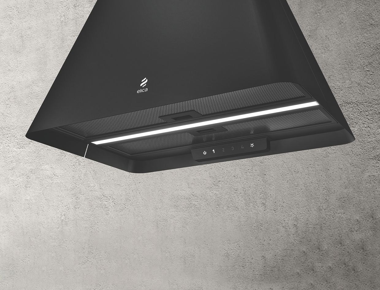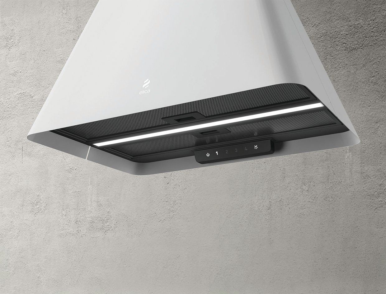 IKONA LIGHT là máy hút mùi và cũng là một chiếc đèn chùm ấm áp có kiểu hình kim tự tháp tối giản, hiện có phiên bản màu đen nhạt, màu trắng và thép không gỉ, tích hợp một dải đèn LED dài chiếu sáng đồng bộ và hài hòa trên bề mặt bếp nấu.